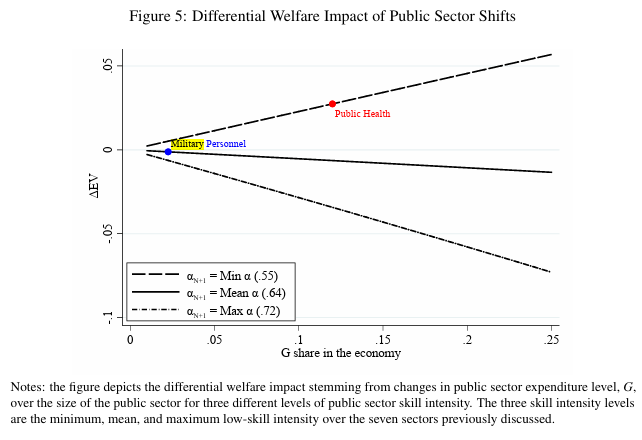 - 公的部門の需要変化では、医療部門と軍事部門の従業者への影響を調べ、民間と比較した相対的な規模と技能集約度が厚生への影響を決めることを示した。