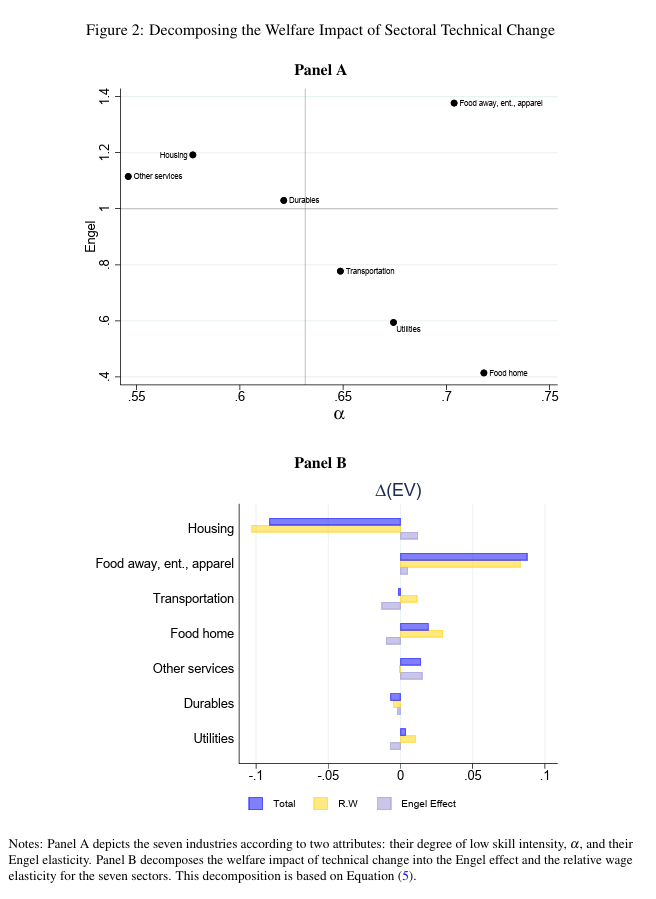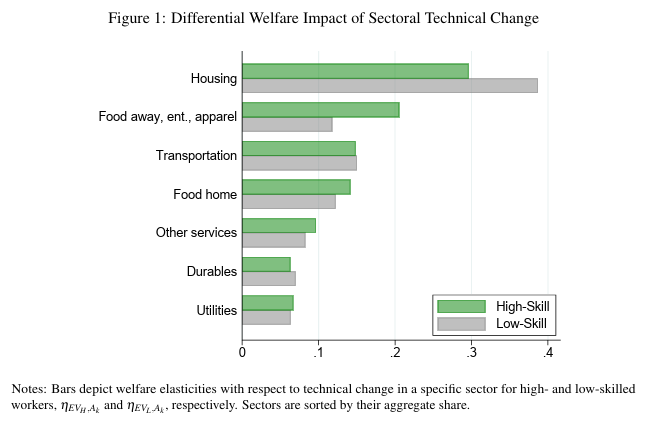 経済は定期的に様々な部門固有の需給変化を経験する。しかし、そうした変化が分配の厚生に及ぼす帰結については良く理解されていない。我々はこのギャップに、消費と生産に特定の関数形を課すこと無しに供給側と需要側の不均一性を同時に統合する分析の枠組みを構築することで取り組んだ。それによって、部門固有の需給変化が分配の厚生に及ぼす影響を形成する主要な力を、消費者の嗜好と部門別生産関数との関係において識別することが可能になった。我々は主要なパラメータを推計し、部門別変化の不均一な厚生への影響を定量化し、その影響の顕著なばらつきを明らかにした。