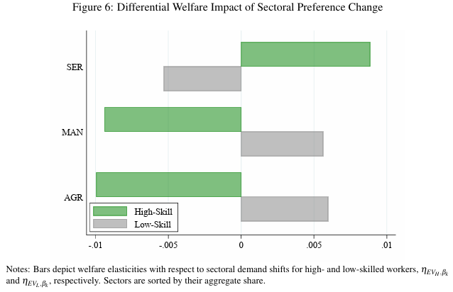 - プラスの需要変化が生じた場合、経済全体に比べて低技能集約的である製造業と農業では低技能労働者の利得が高技能労働者の損失の60%に留まるが、サービスでは高技能労働者の利得が低技能労働者の損失の167%になる。