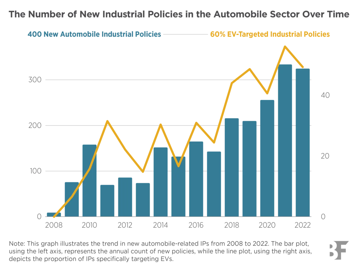 本稿は、世界の自動車産業におけるイノベーションへの産業政策の影響を調べた。我々は、2008年から2023年に掛けての世界の産業政策を、自動車産業と関連する特許データと結び付けた、初めての包括的なデータセットを構築した。我々は政策の焦点の大きな変化を明らかにした。2022年にはすべての産業政策の半分近くが電気自動車(EV)関連部門を対象としていたが、2008年にはほぼゼロだった。その間、内燃機関(GV)技術からEVイノベーションへの明確な技術的遷移があった。我々の分析は、政策支援とイノベーション活動の間の正の関係を見い出した。国レベルでは、EVを対象とした産業政策が5年間の累積で1標準偏差増えることは、新たなEV特許出願が4%増えることと結び付いていた。(OLS、IV、PPML*1を用いた)企業レベルの分析が示すところによれば、自動車メーカーやEV電池生産者が受け取るEVの金銭的なインセンティブが10%増えると、EVイノベーションが同じく4%増えることにつながった。自動車産業の技術変化の方向性における経路依存の重要性を我々は確認したが、EVを対象とした産業政策がGV技術のイノベーションを刺激したという実証結果は得られなかった。